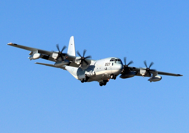 米海兵隊 KC-130J 空中給油機 スーパーハーキュリーズ(岩国基地)、QD 9227番機が離陸 |