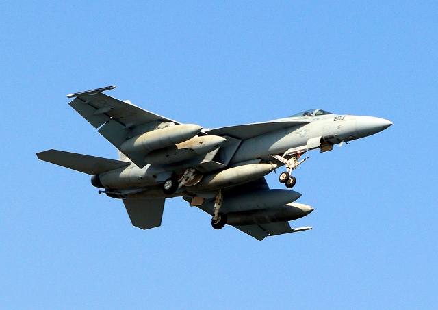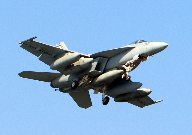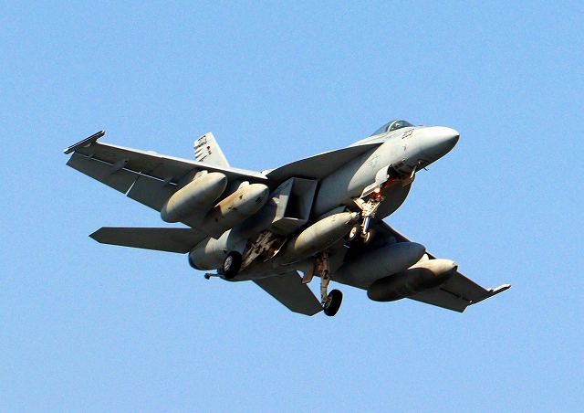 米海軍艦載機 F/A-18E スーパーホーネット 戦闘攻撃機(岩国基地)、NF、203番機が帰還 |