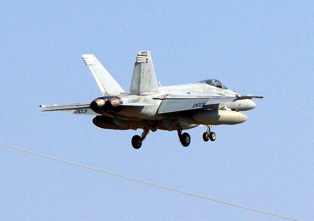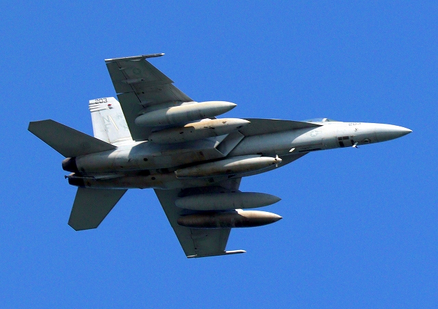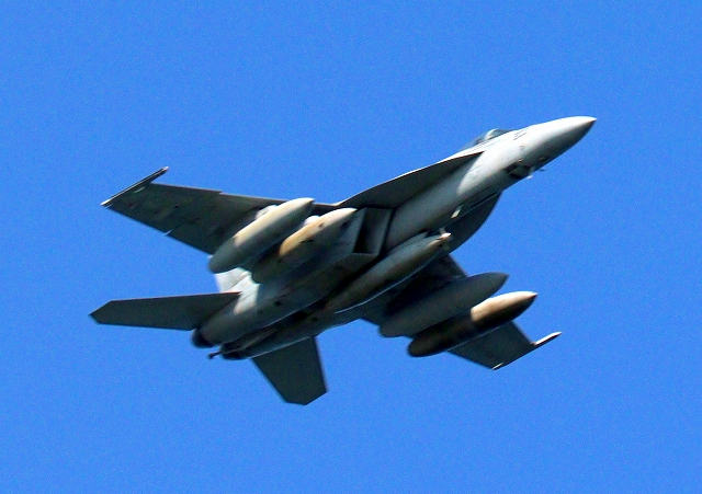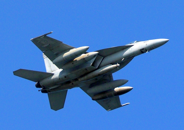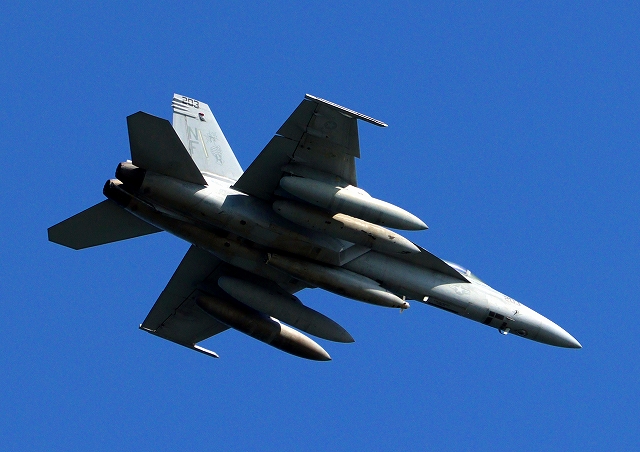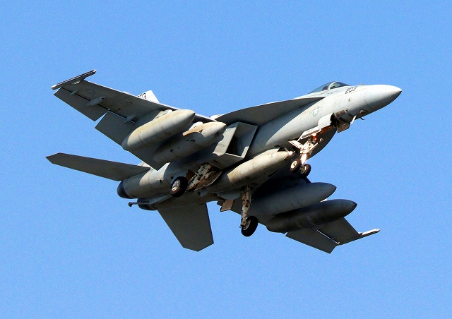 米海軍艦載機 F/A-18E スーパーホーネット 戦闘攻撃機(岩国基地)、NF、203番機が旋回(3周目) |
