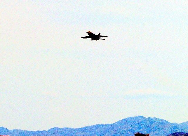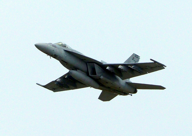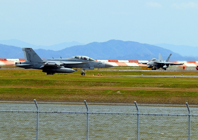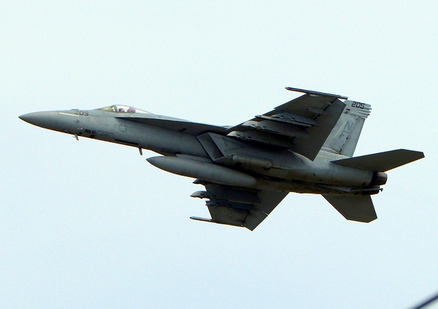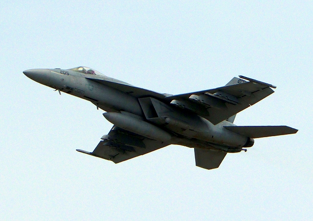 米海軍艦載機 F/A-18E スーパーホーネット 戦闘攻撃機(岩国基地)、NF、205番機が離陸 |