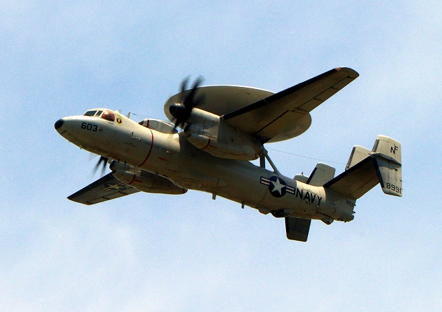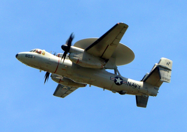 米海軍艦載機 E-2D アドヴァンスド・ホークアイ 早期警戒機(岩国基地)、603番機が旋回 |