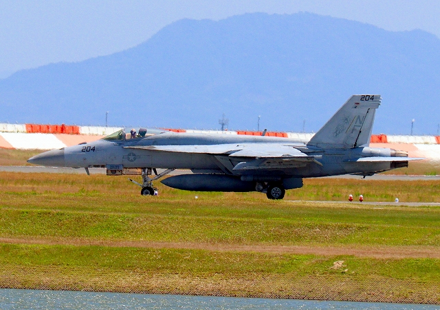 米海軍艦載機 F/A-18E スーパーホーネット 戦闘攻撃機(岩国基地)、NF、204番機が離陸 |