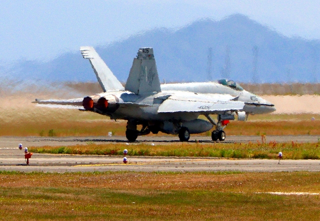 米海軍艦載機 F/A-18F スーパーホーネット 戦闘攻撃機(岩国基地)、NF、103番機が離陸 |