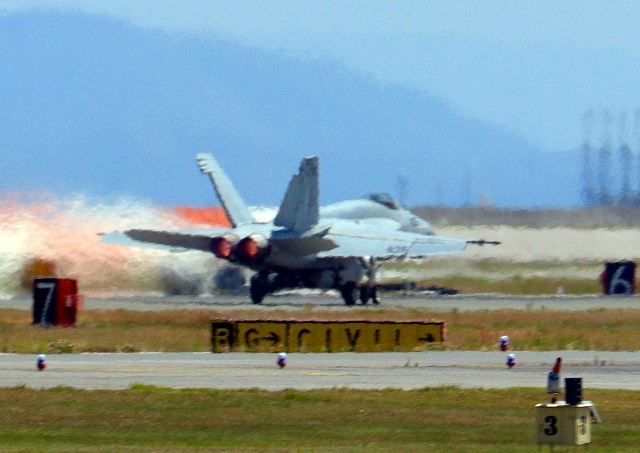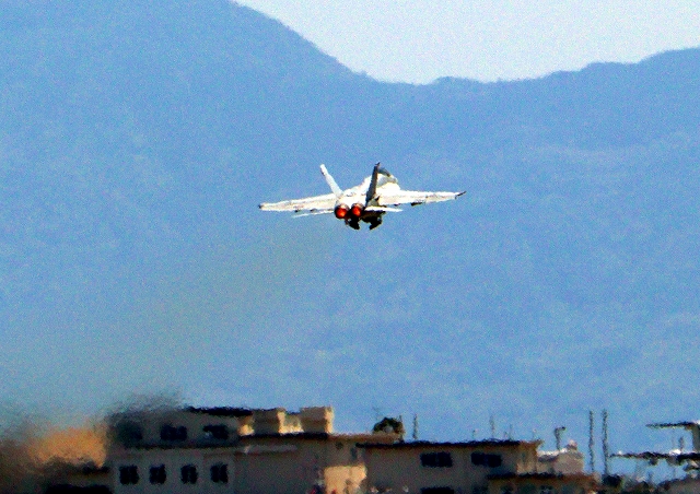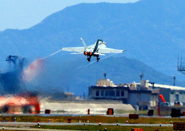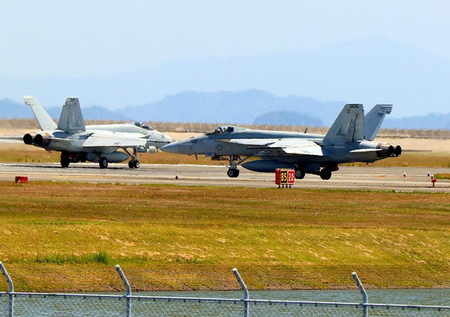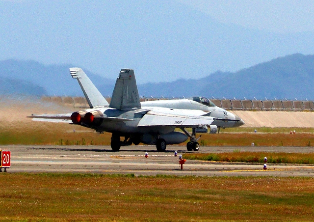 米海軍艦載機 F/A-18E スーパーホーネット 戦闘攻撃機(岩国基地)、NF、405番機が離陸 |