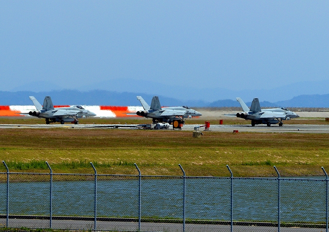 米海軍艦載機 F/A-18E スーパーホーネット 戦闘攻撃機(岩国基地)、NF、404番機が離陸 |