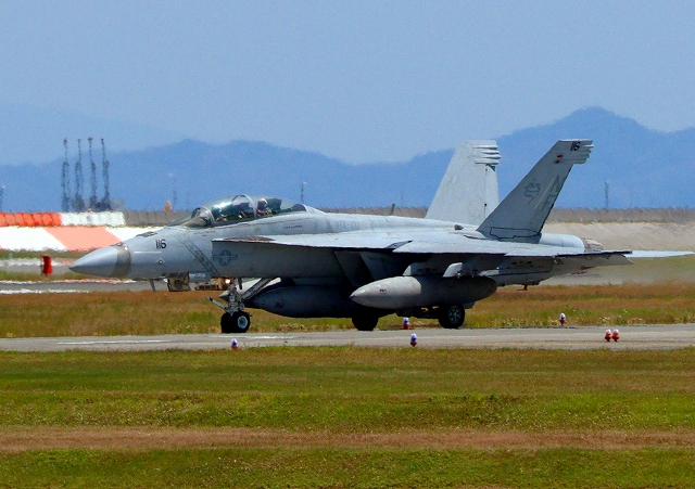 米海軍艦載機 F/A-18F スーパーホーネット 戦闘攻撃機(岩国基地)、NF、116番機が離陸 |