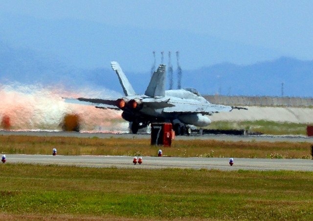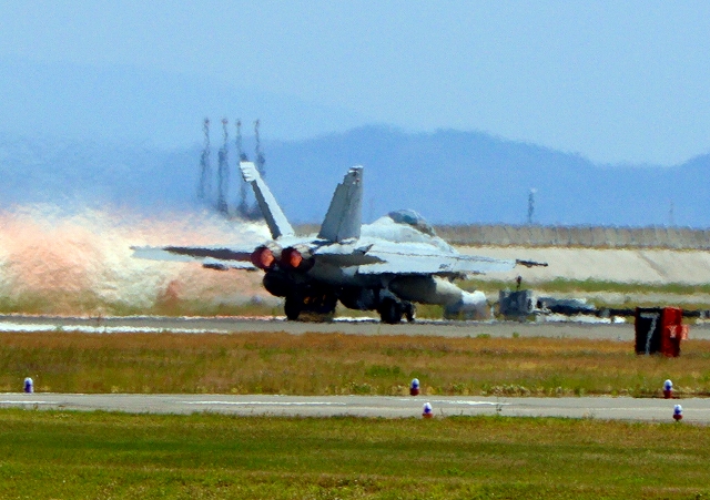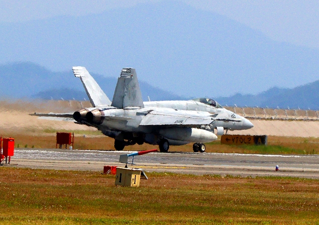 米海軍艦載機 F/A-18E スーパーホーネット 戦闘攻撃機(岩国基地)、NF、215番機が離陸 |