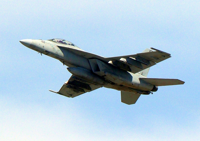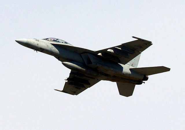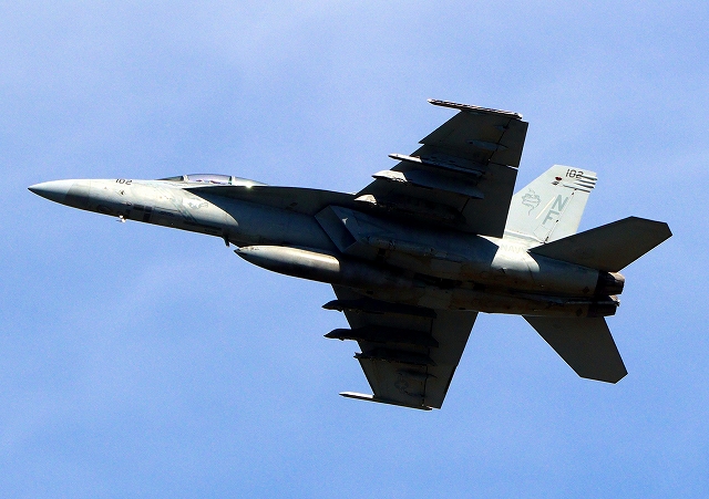 米海軍艦載機 F/A-18F スーパーホーネット 戦闘攻撃機(岩国基地)、NF、102番機が離陸 |