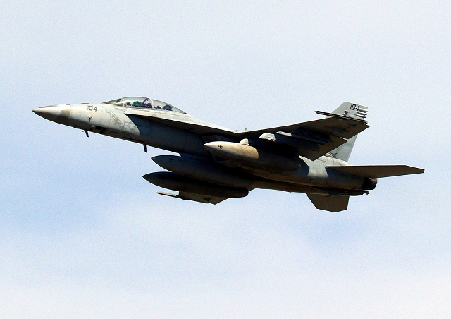 米海軍艦載機 F/A-18F スーパーホーネット 戦闘攻撃機(岩国基地)、NF、104番機が離陸 |