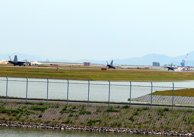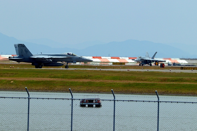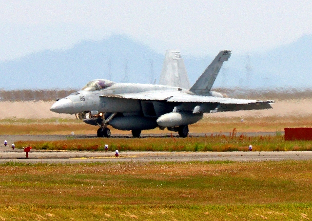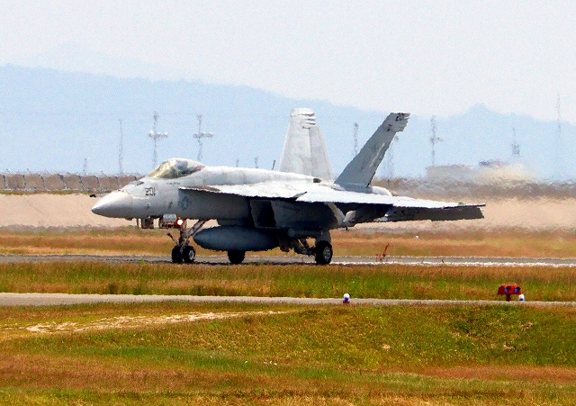 米海軍艦載機 F/A-18E スーパーホーネット 戦闘攻撃機(岩国基地)、NF、201番機が着陸 |