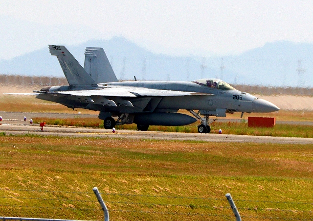 米海軍艦載機 F/A-18E スーパーホーネット 戦闘攻撃機(岩国基地)、NF、205番機が着陸 |