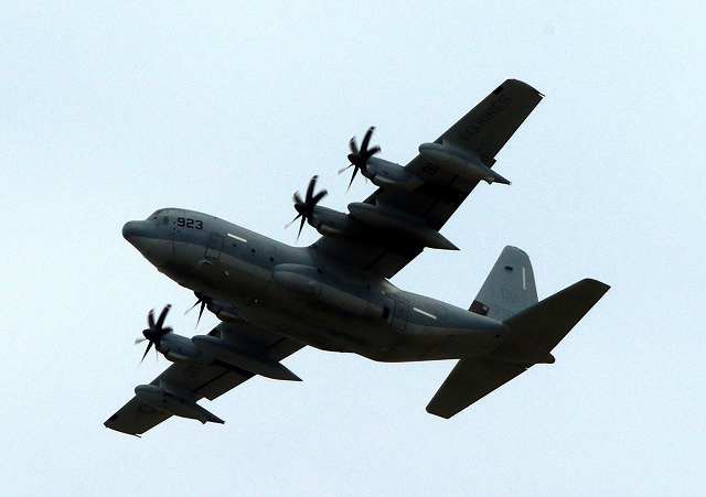 米海兵隊 KC-130J 空中給油機 スーパーハーキュリーズ(岩国基地)、QD 7109番機が旋回 |