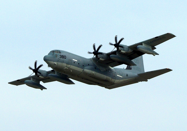 米海兵隊 KC-130J 空中給油機 スーパーハーキュリーズ(岩国基地)、QD 9380番機が離陸 |