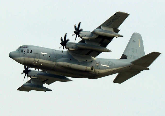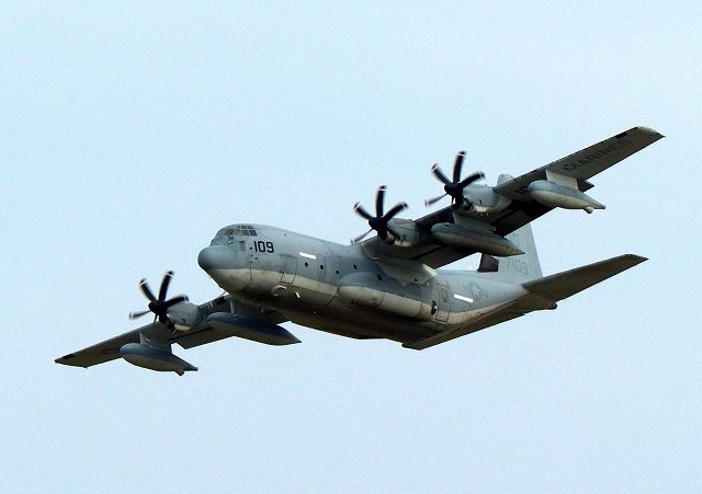 米海兵隊 KC-130J 空中給油機 スーパーハーキュリーズ(岩国基地)、QD 7109番機が離陸 |