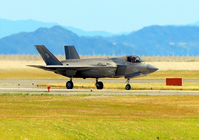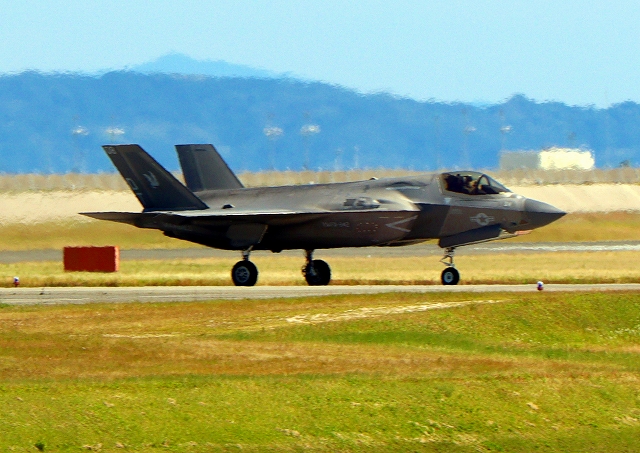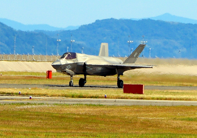 米海兵隊 F-35B ライトニングⅡ 戦闘機(岩国基地)、CE、08番機が着陸 11時27分に離陸した機。41分間の飛行でした。 |
