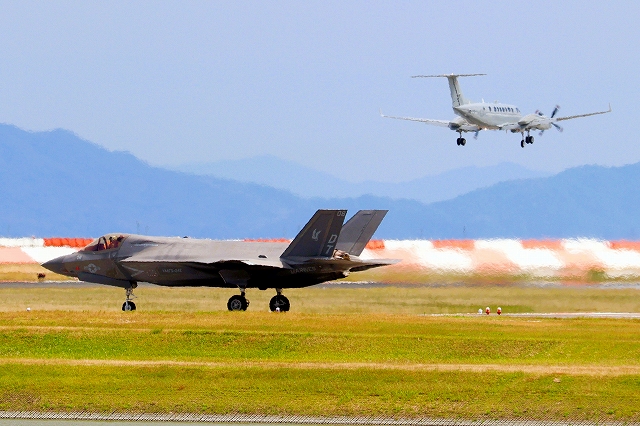 米海兵隊 UC-12W ヒューロン 軽輸送機(岩国基地)、8206番機がタッチアンド・ゴーして旋回 |