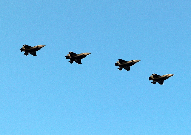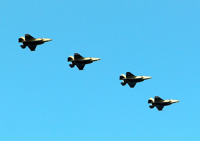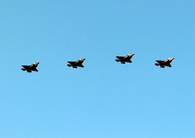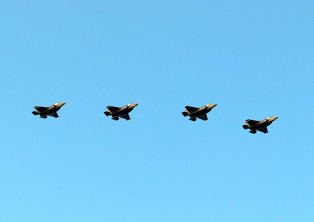 米海兵隊 F-35B ライトニングⅡ 戦闘機(岩国基地)、DT、14番機、CE、09番機、DT、16番機、DT、11番機が4機編隊で帰還 |