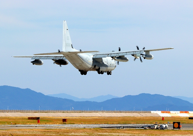 米海兵隊 KC-130J 空中給油機 スーパーハーキュリーズ(岩国基地)、QD 7982番機が離陸 |