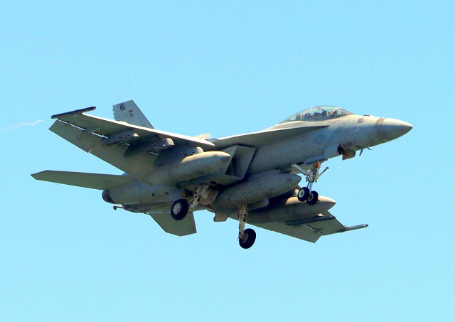 米海軍艦載機 F/A-18F スーパーホーネット 戦闘攻撃機(岩国基地)、NF、116番機が着陸 |