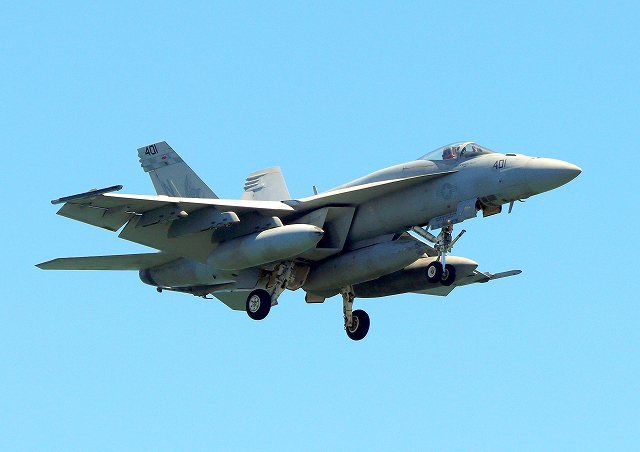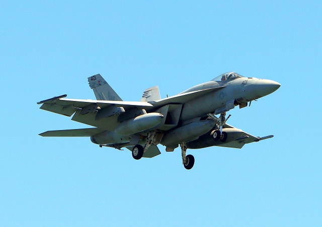 米海軍艦載機 F/A-18E スーパーホーネット 戦闘攻撃機(岩国基地)、NF、401番機が着陸 |