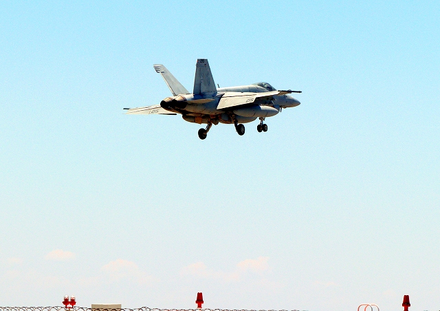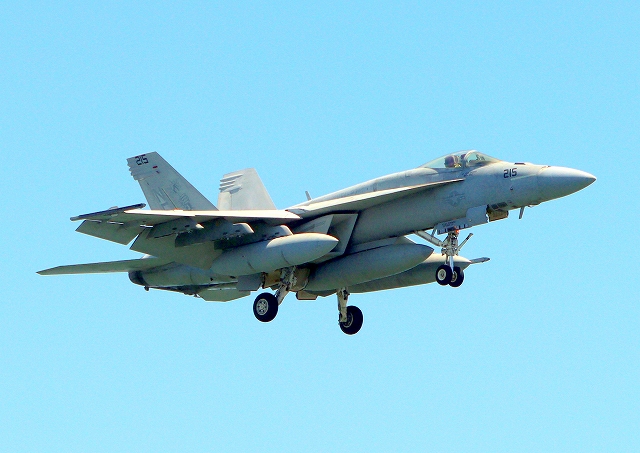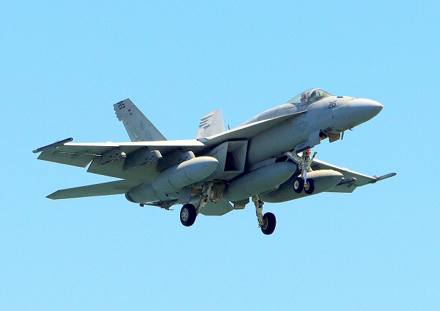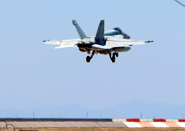 米海軍艦載機 F/A-18E スーパーホーネット 戦闘攻撃機(岩国基地)、NF、215番機が着陸 |