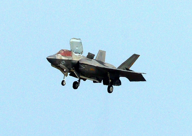 米海兵隊 F-35B ライトニングⅡ 戦闘機(岩国基地)、DT、01番機は垂直着陸パッドの上でホバリング |