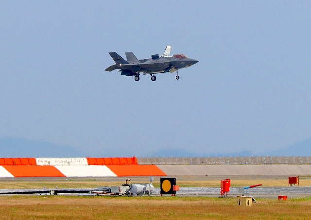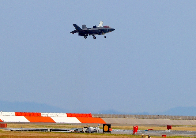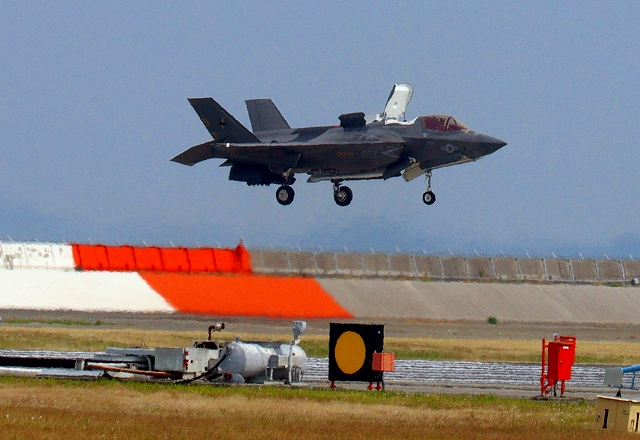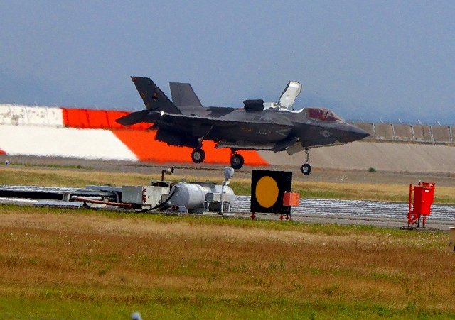 米海兵隊 F-35B ライトニングⅡ 戦闘機(岩国基地)、DT、01番機は垂直着陸パッドの上に着陸