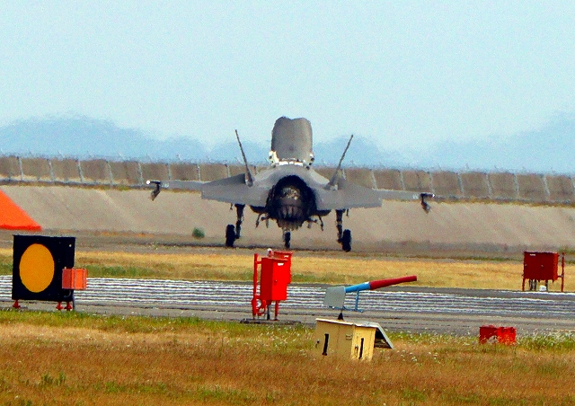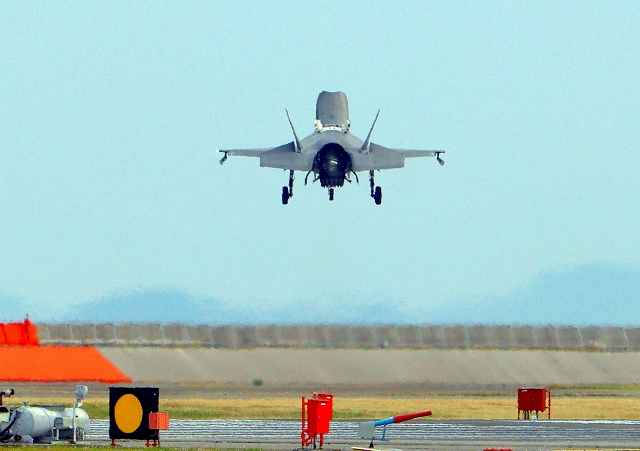 米海兵隊 F-35B ライトニングⅡ 戦闘機(岩国基地)、DT、08番機は、新しい垂直着陸パッドの上でホバリング |