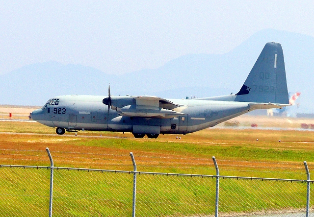米海兵隊 KC-130J 空中給油機 スーパーハーキュリーズ(岩国基地)、QD 7923番機が離陸 |