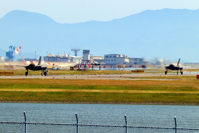米海兵隊 F-35B ライトニングⅡ 戦闘機(岩国基地)、DT、16番機が着陸 12時57分に離陸した機。 1時間12分の飛行でした。 |