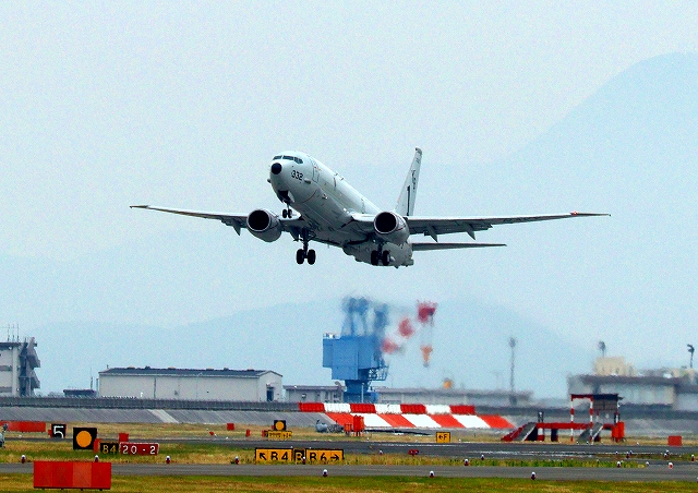 米海軍 P-8A 海上哨戒機 ポセイドン(嘉手納基地、三沢基地)、YB、332番機がタッチアンド・ゴーして旋回(2周目) |