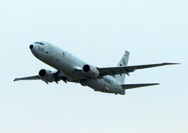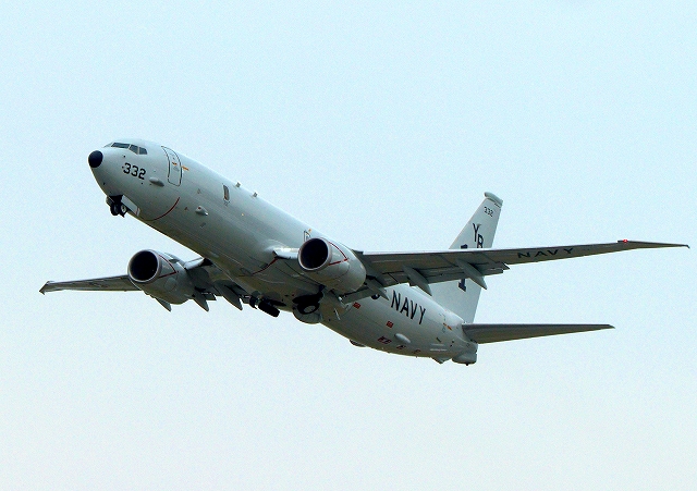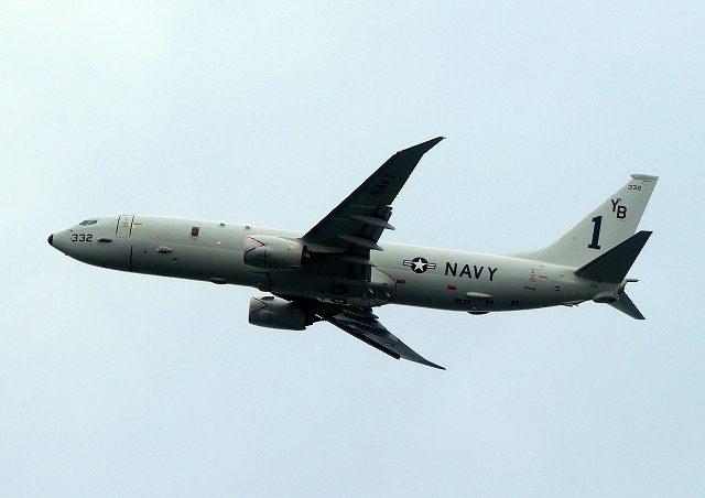 米海軍 P-8A 海上哨戒機 ポセイドン(嘉手納基地、三沢基地)、YB、332番機が旋回(2周目) |