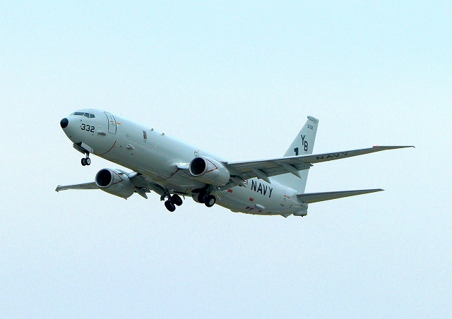 米海軍 P-8A 海上哨戒機 ポセイドン(嘉手納基地、三沢基地)、YB、332番機がタッチアンド・ゴーして旋回(4周目) |