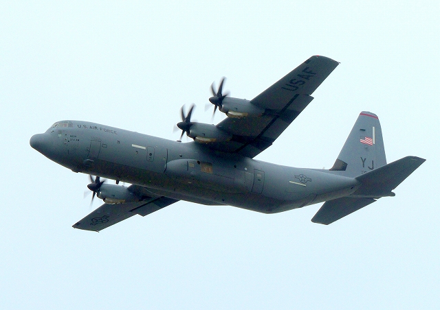 米空軍 C-130J 戦術輸送機 ハーキュリーズ(横田基地)、YJ、604番機がタッチアンド・ゴーして旋回(1周目) |