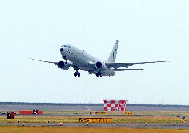 米海軍 P-8A 海上哨戒機 ポセイドン(嘉手納基地、三沢基地)、YB、332番機がタッチアンド・ゴーして旋回(8周目) |