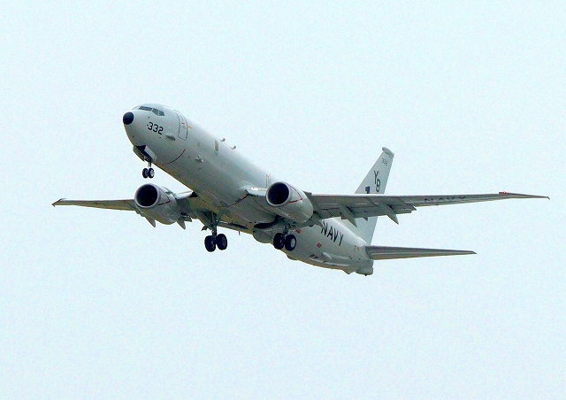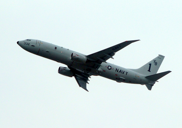 米海軍 P-8A 海上哨戒機 ポセイドン(嘉手納基地、三沢基地)、YB、332番機が旋回(8周目) |