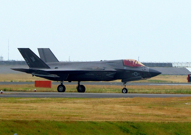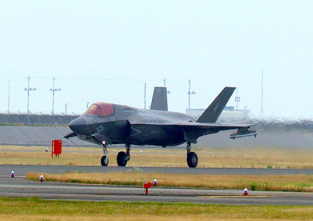 米海兵隊 F-35B ライトニングⅡ 戦闘機(岩国基地)、DT、15番機が着陸 12時35分に離陸した機。1時間03分の飛行でした。 |