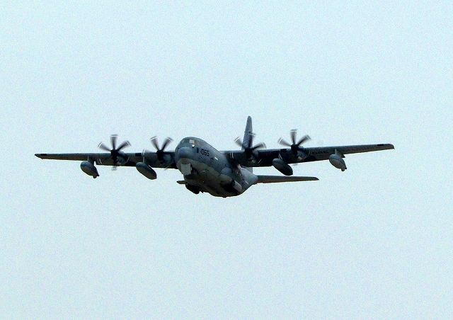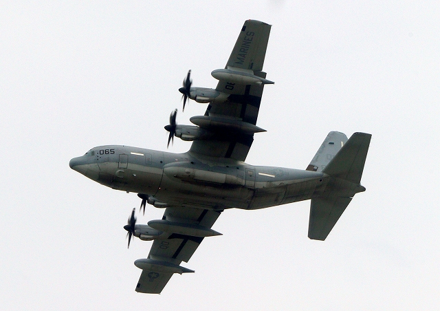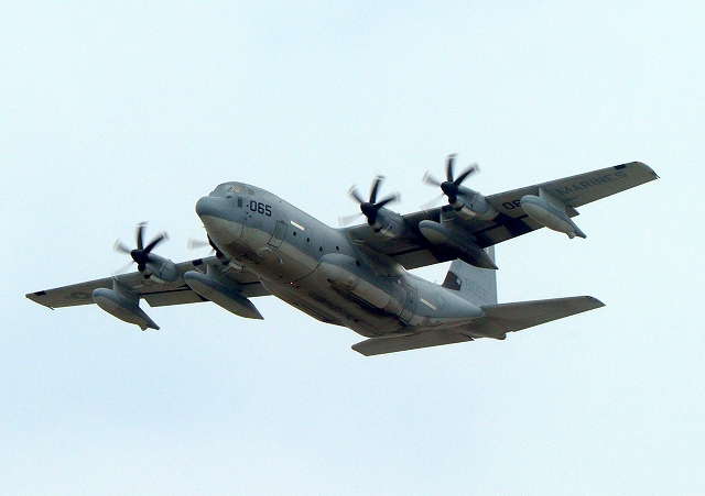 米海兵隊 KC-130J 空中給油機 スーパーハーキュリーズ(岩国基地)、QD 8065番機が離陸 |