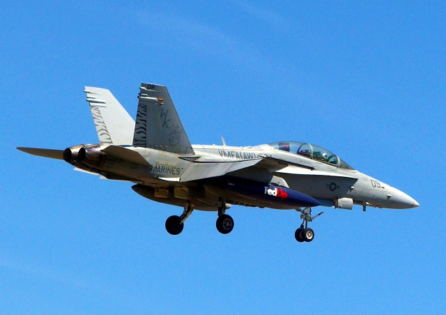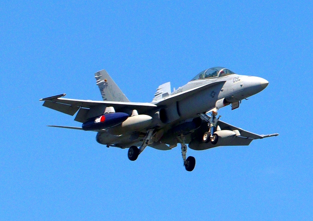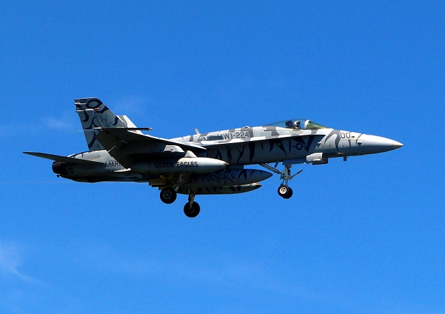 米海兵隊 F/A-18C ホーネット 戦闘攻撃機(岩国基地)、WK、00番機が着陸 |