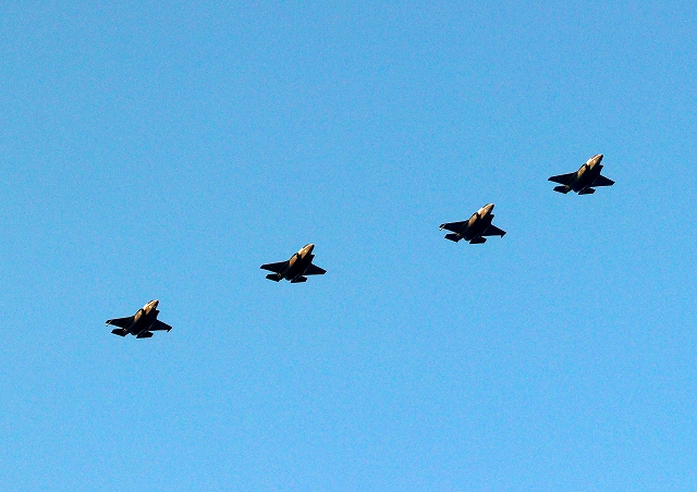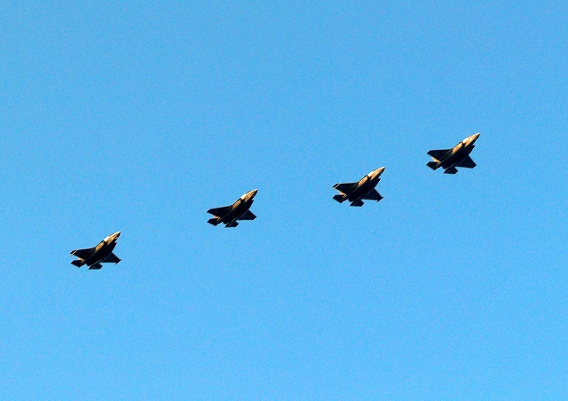 米海兵隊 F-35B ライトニングⅡ 戦闘機(岩国基地)、DT、12番機、13番機、01番機、16番機が4機編隊で帰還 |