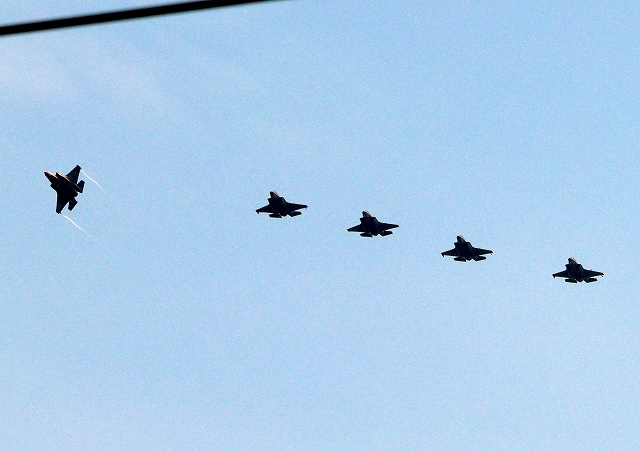 米海兵隊 F-35B ライトニングⅡ 戦闘機(岩国基地)、VK、01番機、02番機、00番機、14番機、04番機が5機編隊で帰還 |