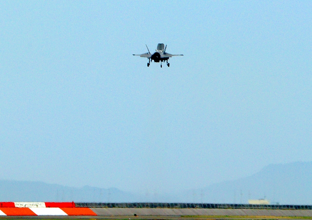 米海兵隊 F-35B ライトニングⅡ 戦闘機(岩国基地)、VK、00番機は新しい垂直着陸パッドの上でホバリング、着陸 13時10分に離陸した機。1時間18分の飛行でした。 |