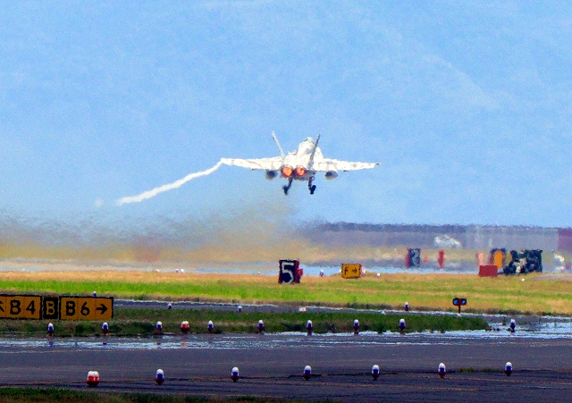 米海兵隊 F/A-18C ホーネット 戦闘攻撃機(岩国基地)、WK、00番機が離陸 |