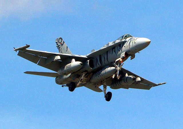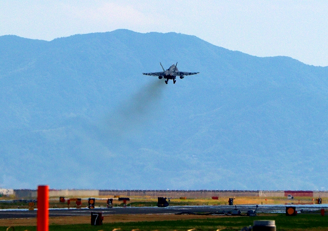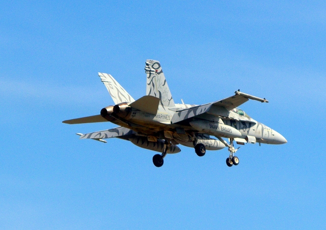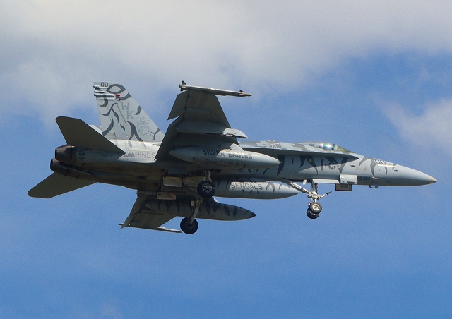 米海兵隊 F/A-18C ホーネット 戦闘攻撃機(岩国基地)、WK、00番機が旋回(2周目) |