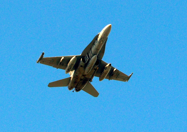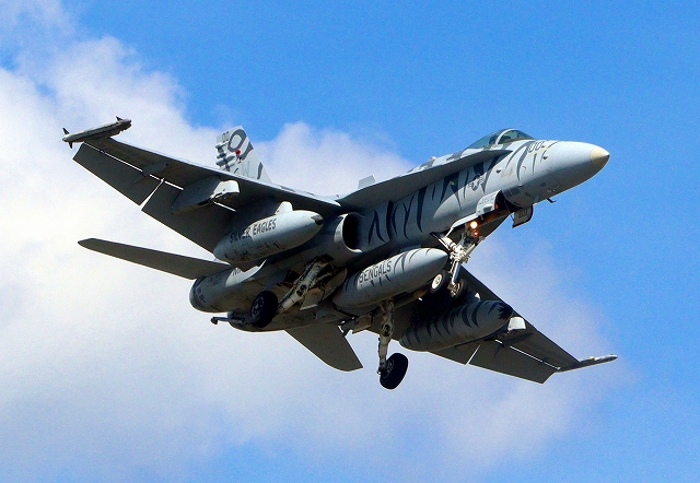 米海兵隊 F/A-18C ホーネット 戦闘攻撃機(岩国基地)、WK、00番機が旋回(3周目) |