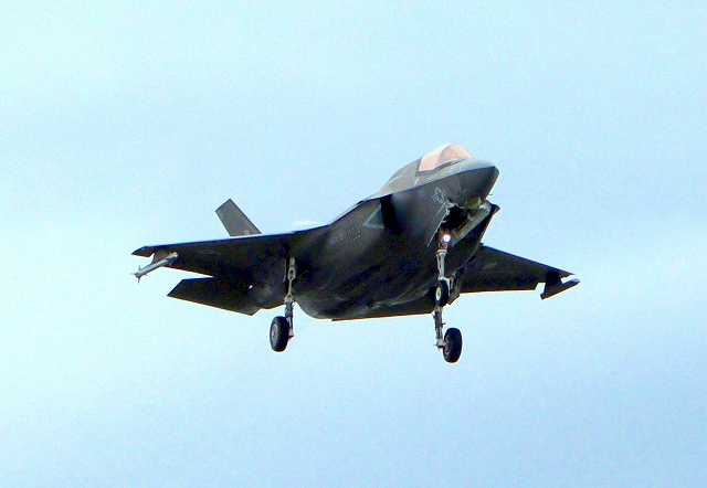 米海兵隊 F-35B ライトニングⅡ 戦闘機(岩国基地)、VK、00番機が着陸 13時17分に離陸した機。1時間17分の飛行でした。 |