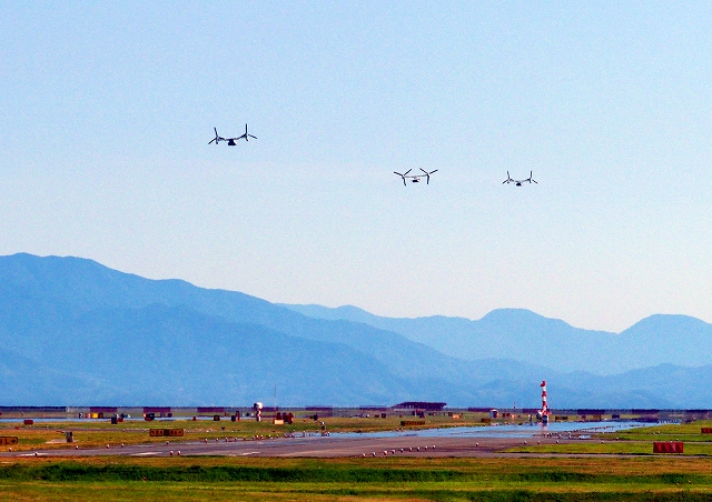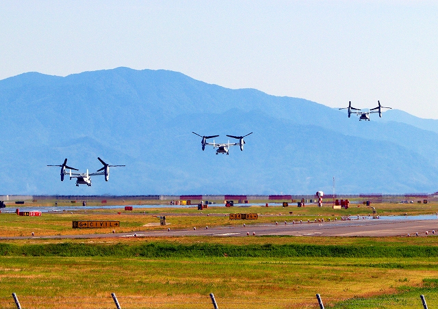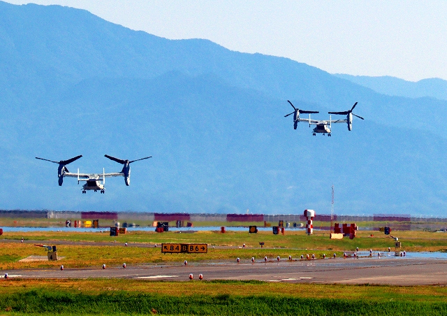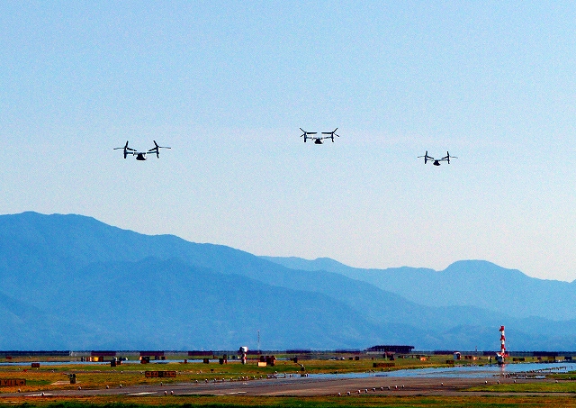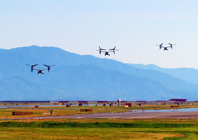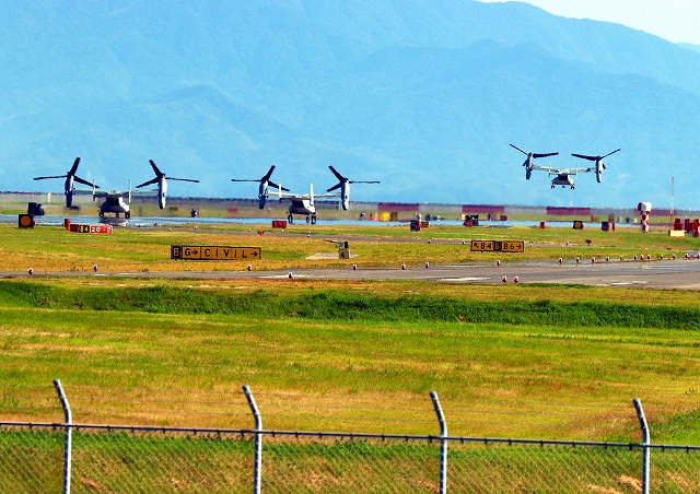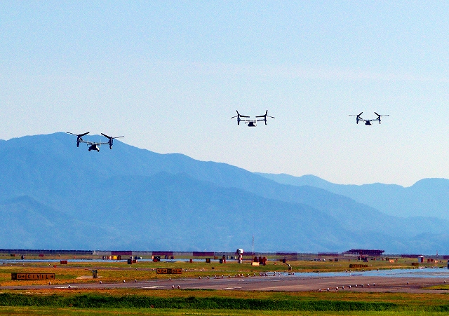 米海兵隊 MV-22B オスプレイ(普天間基地)、EP、09番機、10番機、14番機が離陸 |