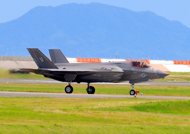 米海兵隊 F-35B ライトニングⅡ 戦闘機(岩国基地)、DT、15番機が着陸 |