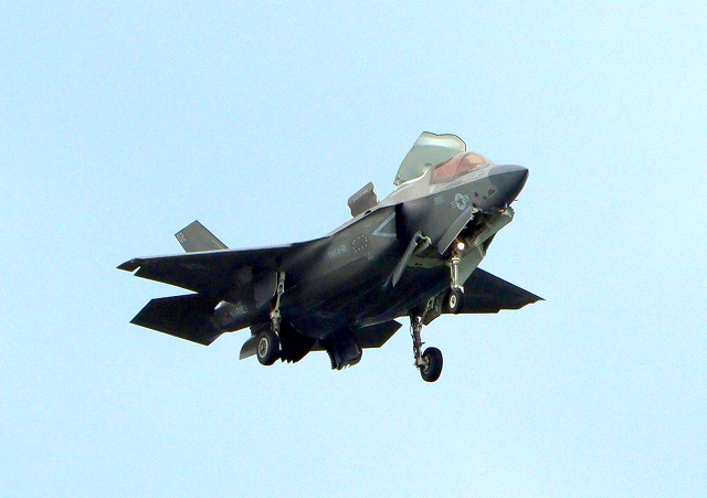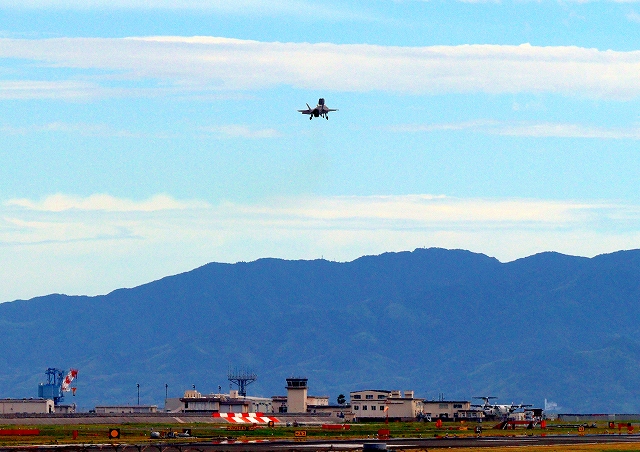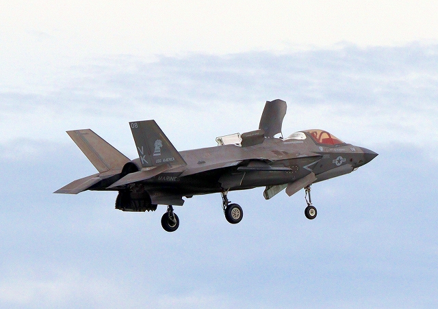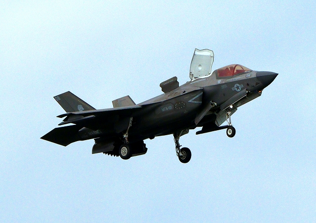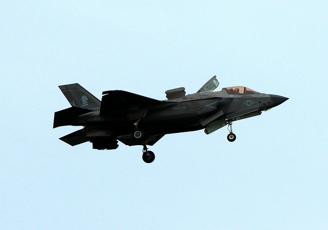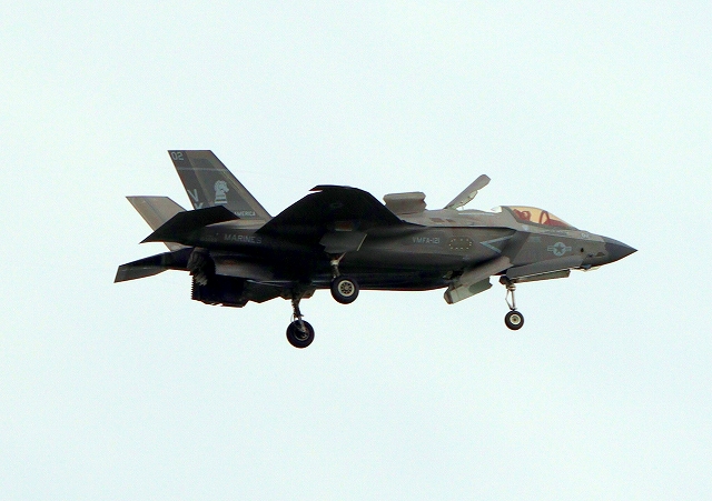 米海兵隊 F-35B ライトニングⅡ 戦闘機(岩国基地)、VK、08番機が短距離着陸 |