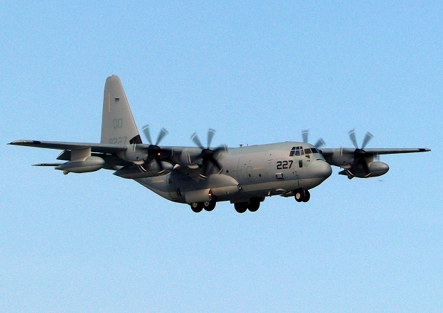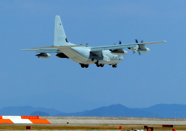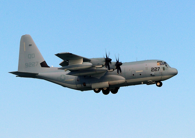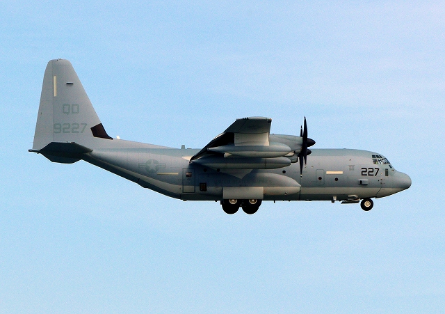 米海兵隊 KC-130J 空中給油機 スーパーハーキュリーズ(岩国基地)、QD 9227番機が着陸 |